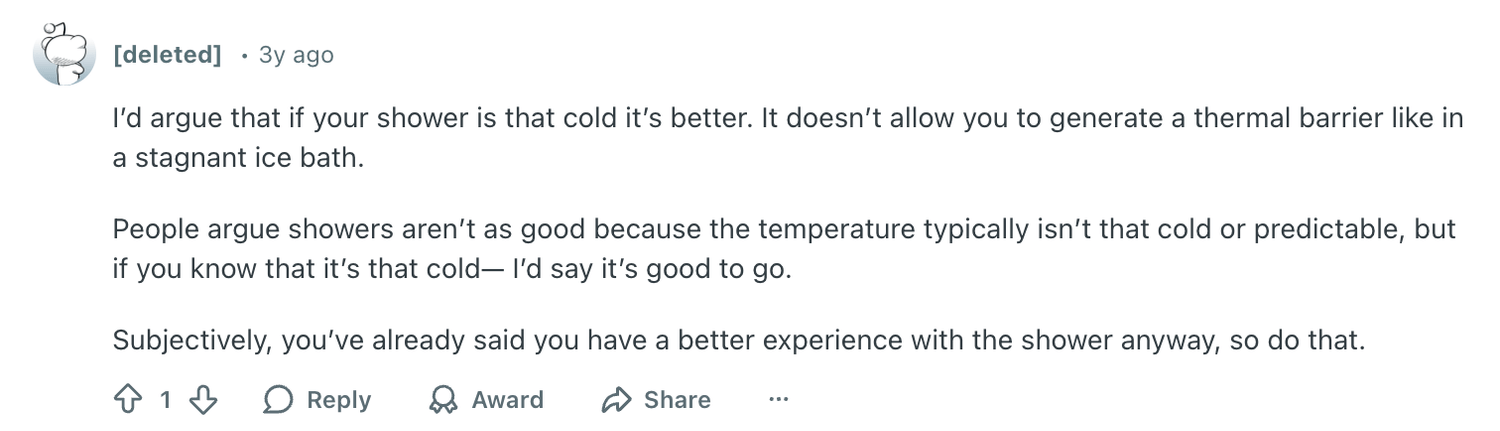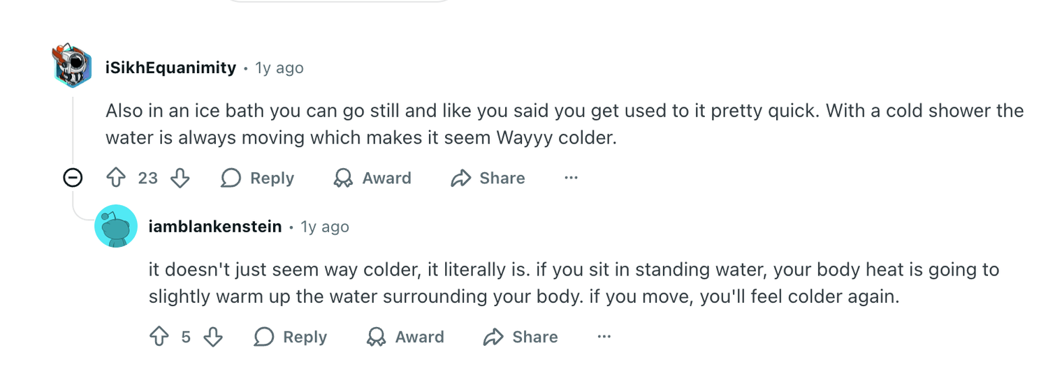 Reddit users confirm: 'Taking a shower can pose more of a challenge since you don't create a thermal barrier' and 'cold shower water in constant motion negates thermal layer'.โ